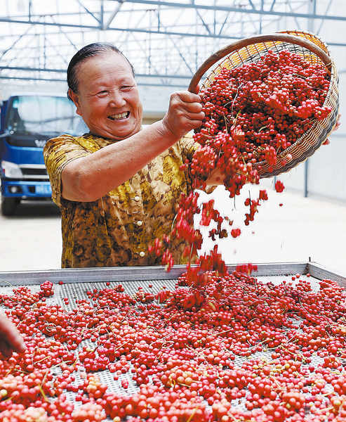 近日,洛南县保安镇黑潭村五味子进入采摘期。红色的五味子好像玛瑙,为这个丰收季增添了许多喜悦。图为8月19日农户抢抓晴好天气采收果实。 (本报通讯员 阮世喜 摄)