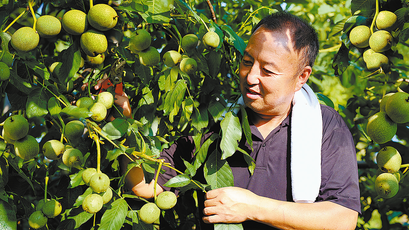 8月3日,在洛南县景村镇,华阳一升红仁核桃专业合作社的技 术人员正在检查核桃生长情况。 (本报通讯员 吴书怀 摄)