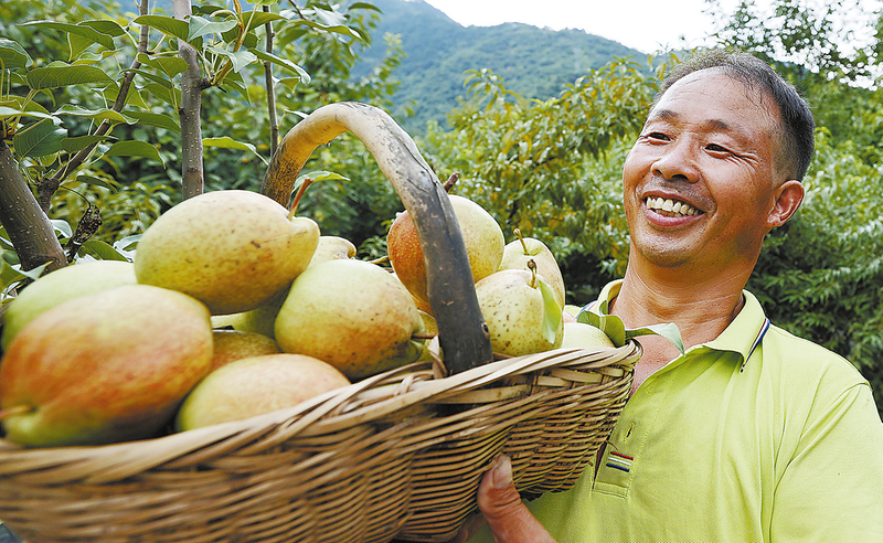 8月9日,在丹凤县商镇王塬村,水杂果种植户捧着刚摘的脆梨,掩不住满脸喜悦。 (本报通讯员 阮世喜 摄)