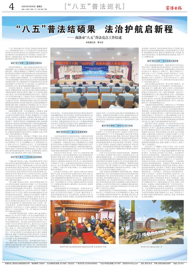 “八五”普法实施以来,在市委、市政府的坚强领导和市人大、市政协的监督支持下,全市各级各部门认真落实普法责任制,扎实开展全民普法,深入推进依法治理,全体公民法治素养和社会治理法治化水平明显提升,为加快打造“一都四区”、推进富民强市,奋力谱写商洛高质量发展、现代化建设新篇章贡献了法治力量。