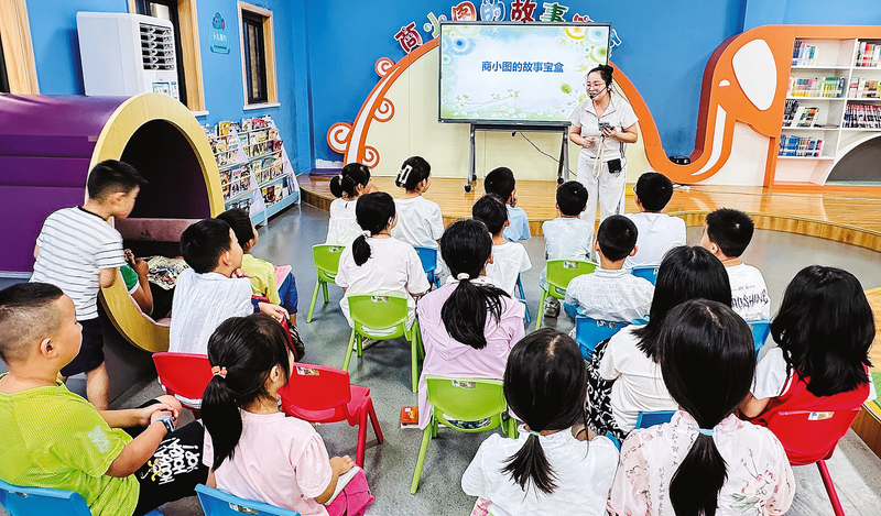 8月28日,市图书馆一楼多功能少儿阅览区内“商小图的故事宝盒”暑期故事讲读活动正在举行。本次活动由主讲人小燕老师为40多位小读者带来一个关于“好运”的温暖绘本故事——《五个好运气》。 (本报记者 方 方 摄)