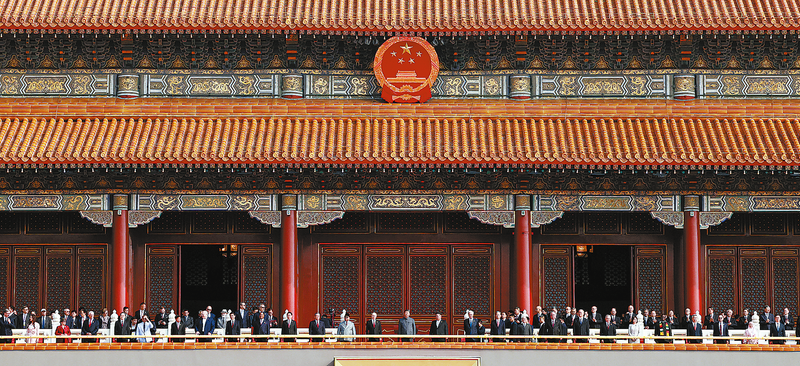 大会开始前,习近平和夫人彭丽媛在端门外广场迎接出席大会的外方代表团团长及其配偶,并同他们合影留念。