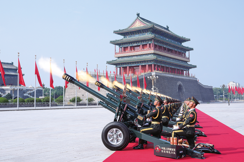 9月3日,纪念中国人民抗日战争暨世界反法西斯战争胜利80周年大会在北京天安门广场隆重举行。这是礼炮在天安门广场鸣响。 (新华社记者 牟 宇 摄)