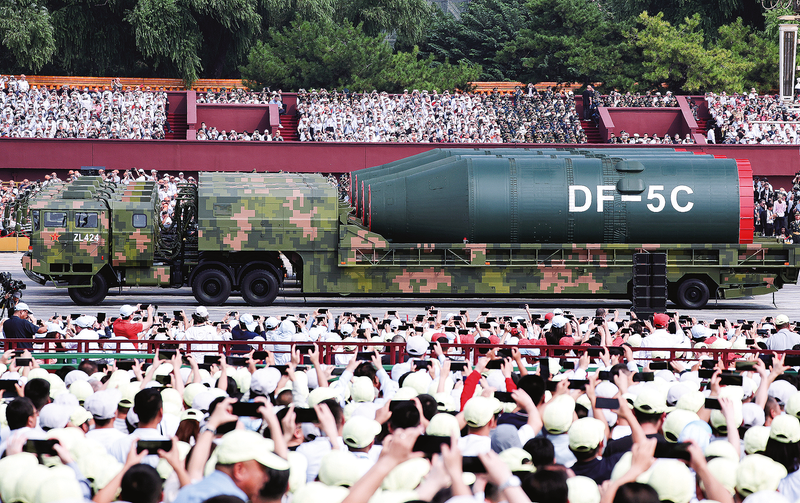 9月3日,纪念中国人民抗日战争暨世界反法西斯战争胜利80周年大会在北京隆重举行。这是核导弹第二方队接受检阅。 (新华社记者 张 涛 摄)