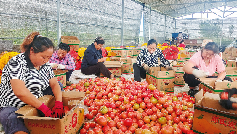 9月2日,洛南县四皓街道中心村瓜果蔬菜基地内,务工群众正在将成熟的西红柿分拣、装箱。该基地共有110个蔬菜大棚,目前第二茬西红柿陆续成熟,来自渭南、西安、河南的客商以每公斤3元的价格上门收购,预计该基地第二茬西红柿产量15万公斤以上。 (本报通讯员 陈晓锋 摄)