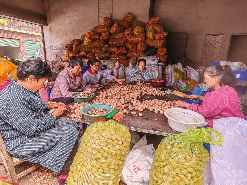 9月8日,20余名群众在洛南县城关街道西寺社区一家核桃收购加工点加工核桃仁。据了解,务工群众来自县城周边及易地搬迁社区的留守妇女和脱贫户,工作时间灵活,既能照顾家庭,还能增加收入,加工每公斤核桃仁能挣2.4元,每人每月可收入1500元以上。 (本报通讯员 刘卫锋 摄)