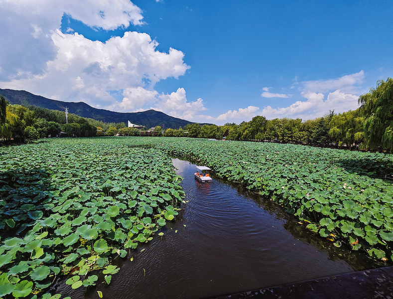 8月20日,在丹凤县棣花古镇,游客在千亩荷塘间划船。陕西日报记者 王佳伟