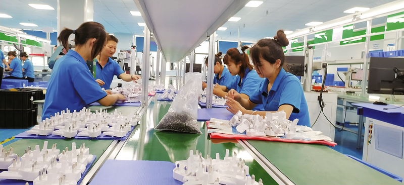 9月9日,位于商州区电子信息产业园的陕西汇宇智能科技有限公司车间内,工人正在生产电源适配器。该公司为劳动密集型企业,安置就业近百人,人均月收入3000元左右。 (本报记者 贾书章 摄)