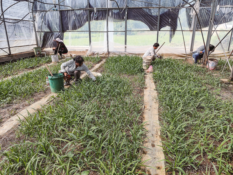 9月12日,务工妇女在商州区麻街镇中流村仙湖现代农业产业园白及大棚里清除杂草。该园区今年完成白及育苗20多万株,每天雇佣10多名妇女在园区务工增收。 (本报记者 贾书章 摄)