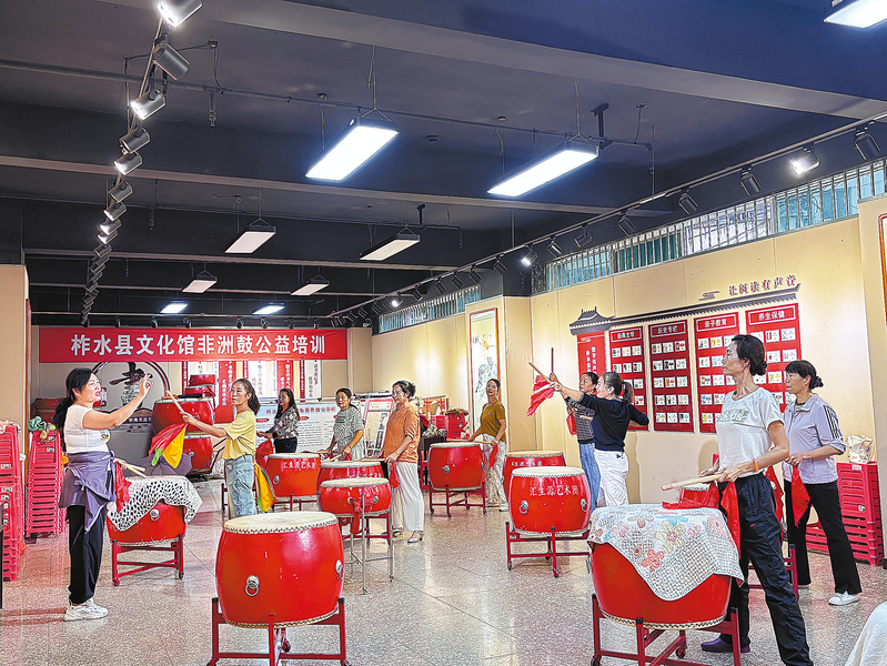 9月10日,在柞水文化艺术中心一楼综合展厅,一群退休群众正以中华鼓为载体,自发开展《中华魂》鼓乐培训,为中秋佳节精心筹备。她们挥槌击鼓,传递着对传统文化的热爱,更以饱满热情展现退休生活的艺术风采,用鼓点奏响中秋团圆的序曲。 (本报记者 朱良娜 摄)