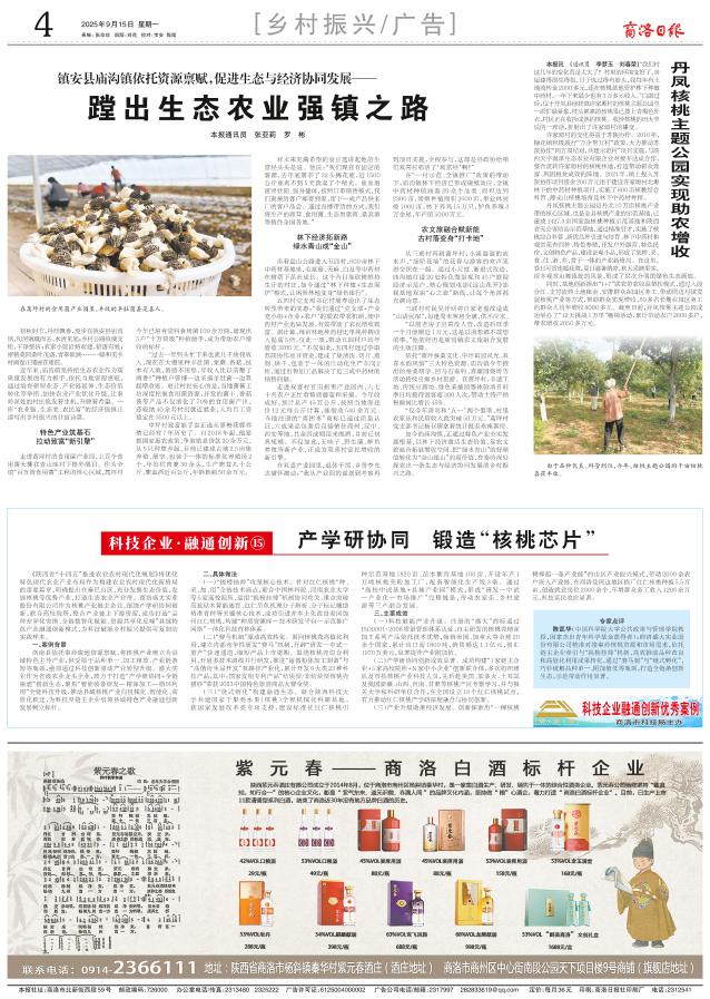 (三)“链式孵化”构建融通生态。联合陕西科技大学共建国家干果类水果(核桃)全程机械化科研基地,获国家发展改革委专项支持,建设标准化红仁核桃引种示范基地1820亩、苗木繁育基地100亩,开设年产1万吨核桃壳粉加工厂,配备智能化生产线3条。通过“高校中试基地+县域产业园”模式,形成“研发—中试—产业化—市场推广”完整链条,带动农家乐、乡村旅游等三产融合发展。