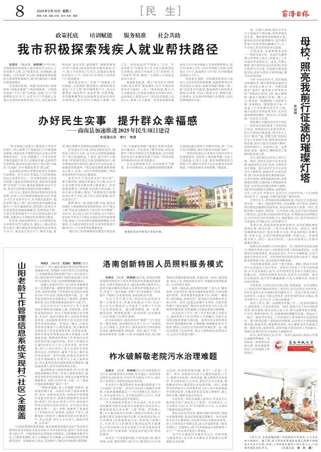 本报讯 (记者 巩琳璐)近年来,洛南县积极贯彻落实国家关于基本养老服务体系建设的政策要求,以城关街道为试点,通过政府购买服务方式,成功开展分散供养特困人员照料护理服务试点工作,形成了一套可复制、可推广的“洛南模式”,有效提升了特困人员的获得感、幸福感和安全感。