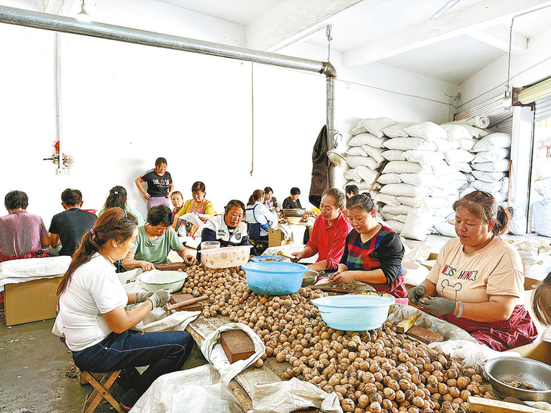 9月12日,丹凤县棣花镇一处核桃加工作坊内,工人正在加工核桃仁。据了解,该工作坊经营者张双虎已深耕干核桃加工行业十几年,目前,工作坊每天雇用三四十名工人,人均每月增收2000多元。 (本报记者 谢 非 摄)