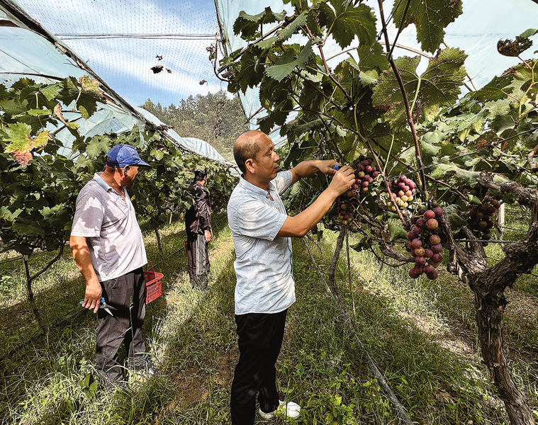 9月16日,在商南县富水镇王家楼村的葡萄园大棚里,工人正在采摘葡萄。该葡萄园以沪太八号葡萄为主打品种,今年预计产量30吨,年产值30万元左右。 (本报记者 胡 蝶 摄)