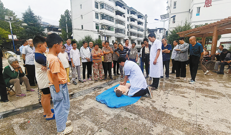 近日,山阳县法官镇卫生院在辖区内组织开展心肺复苏急救知识宣讲活动,卫生院医护人员向群众讲解了心脏骤停的危害、心肺复苏的重要性以及心肺复苏的基础知识和操作技巧,并引导其参与和熟悉心肺复苏抢救流程,掌握应急救护基本技能。 (本报通讯员 杨枝烨 摄)