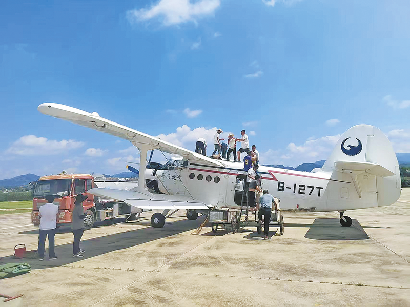 △市飞播站组织装种队向飞机上加装树种,为播撒“绿色希望”做好准备。