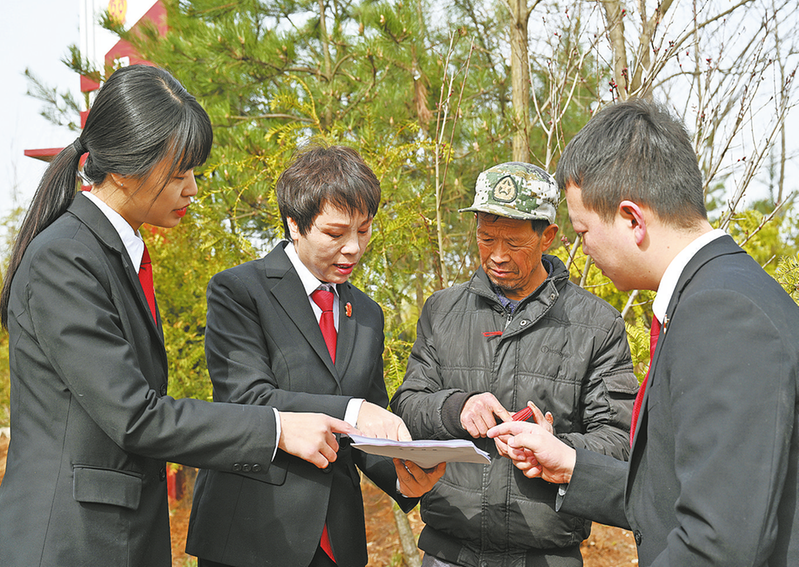 除做好案件审理工作外,周梦琳(左二)还挤出时间向群众宣传秦岭生态保护的意义。 (资料图片)本报记者 南 玺 王孝竹