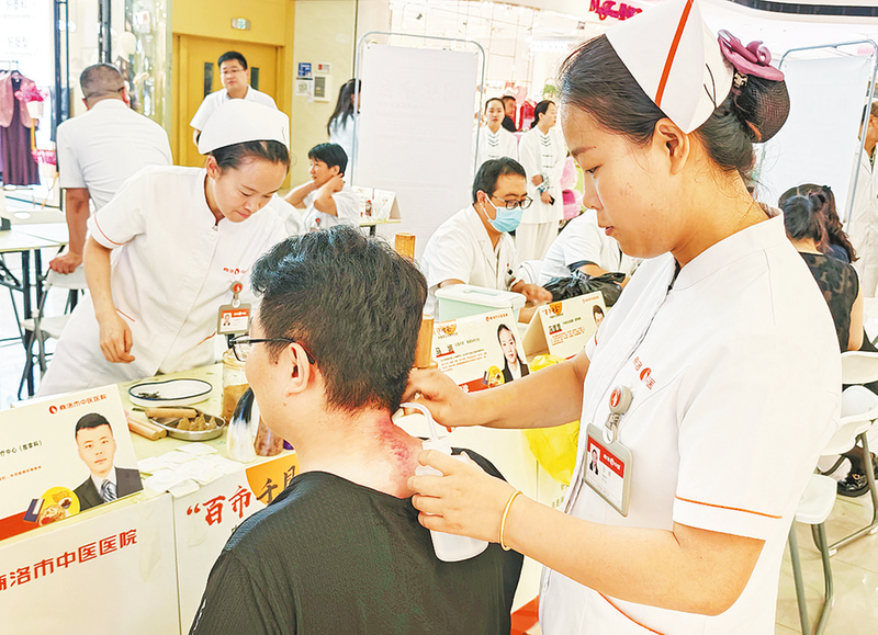为普及中医药养生知识、推广中医特色疗法,9月17日晚,市中医医院在万达广场开展“百市千县”中医药文化惠民活动。活动设置有义诊、中医药服务体验等环节,为过往市民提供针灸、艾灸等体验,还演示传统养生功法“八段锦”并邀请群众跟练。 (本报记者 张 英 摄)