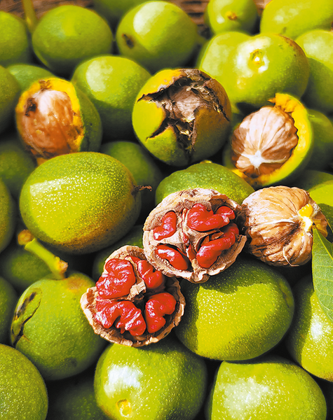 红仁核桃因其成熟期较晚、避晚霜能力强、丰产性好而深受种植户的喜爱。红仁核桃具有仁色鲜红、营养价值极高、口感酥脆微甜等特点,富含花色苷及鞣花单宁,具有抗氧化、抗衰老、抗癌、保护心血管、调节胆固醇、增强免疫力的功效,被人们称为“核桃中的贵族”,是世界稀有品种。2015年开始,商洛盛大实业股份有限公司瞄准市场机遇,从美国加利福尼亚州引种了红仁核桃品种,开展了系统引种研究取得成功。目前,公司通过土地流转已建成试验田、示范园1820亩。在市、县政府的大力支持下,采取“政府推动、企业带动、示范引领、效益拉动”等推广模式,通过8年努力,推广面积达5万亩,有力推动了核桃产业升级换代、提质增效。