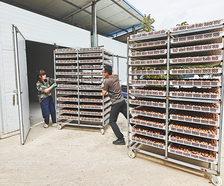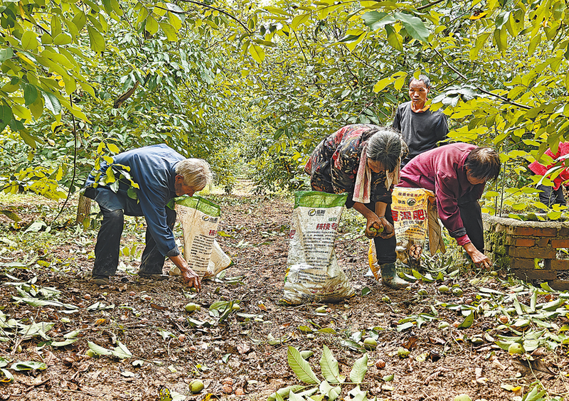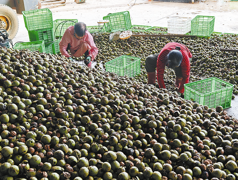 △刚刚从树上打下来的鲜核桃,村民及时捡拾,收集后运送至厂区。