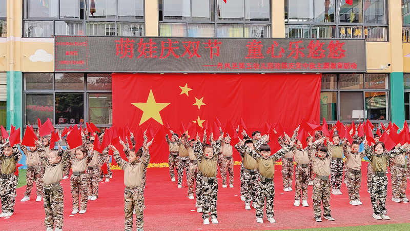 9月26日,丹凤县第五幼儿园开展国庆系列活动。孩子穿着整齐服装模拟“阅兵”,师生共唱红歌、展演团体操等。 (本报通讯员 何 亚 摄)