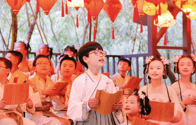 百福桥边的空地上,身着汉服的孩子正在吟诵经典古诗词。