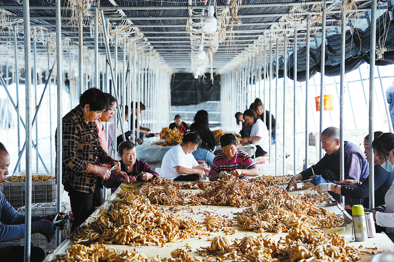 10月11日,山阳县户家塬镇康乐村食用菌基地里,工人正在进行滑子菇筛选去根。据了解,该基地由山阳县乡村振兴投资开发有限公司经营,占地面积55.8亩,带动周边300余名群众就近务工。 (本报记者 南 玺 摄)