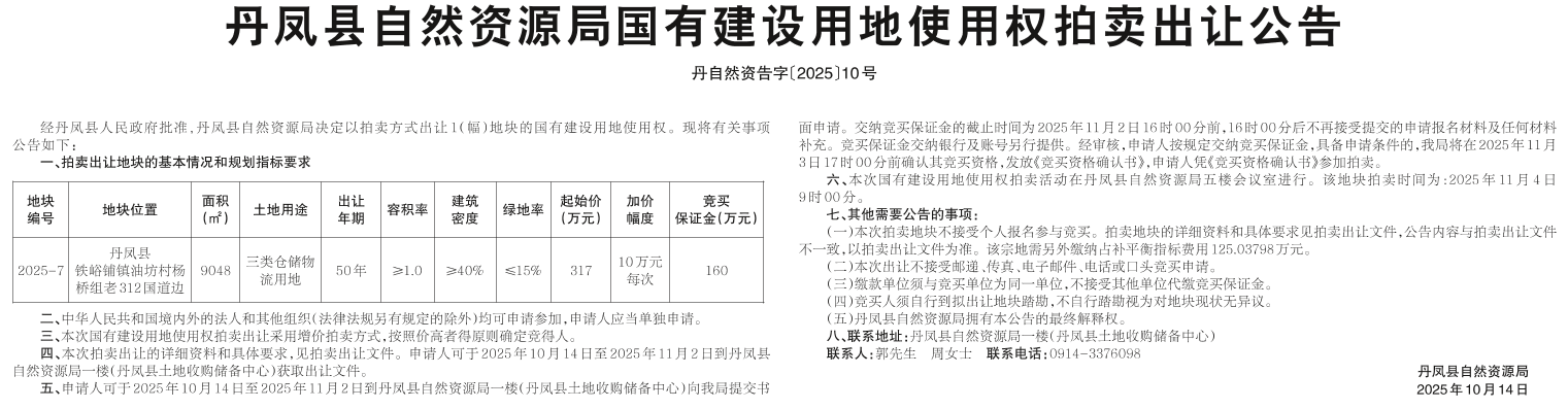 丹凤县自然资源局国有建设用地使用权拍卖出让公告