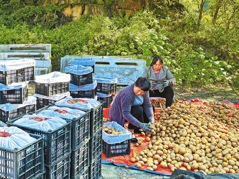10月14日,商南县金丝峡镇江西沟村猕猴桃产业基地里,工人正在分拣猕猴桃鲜果。据悉,今年该村100亩猕猴桃喜获丰收,预计总产量达10万公斤,总产值有望突破45万元。猕猴桃产业带农增收的同时,每年还为村集体带来10万多元的收入。 (本报记者 马泽平 摄)