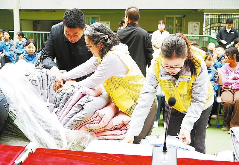 在商洛市慈善协会、商州区慈善协会、市妇联、市巾帼志愿者协会的积极联络下,10月9日,苏州工业园区汤妈妈公益慈善中心的爱心人士为商州区杨斜镇、牧护关镇等辖区9所中小学住校生及部分困难儿童捐赠被褥、床单、被罩等御冬物资555套,价值11.1万余元。 (本报记者 肖 云 摄)
