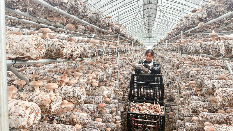 近年来,湘河镇大力发展菌菇产业促进村民增收。图为10月10日,后坪村村民魏彩菊在村香菇种植基地里采摘香菇。金秋时节,秦岭深处色彩斑斓。10月10日,走进商南县湘河镇后坪村的香菇种植基地,一股浓郁的菌菇清香便伴着湿润温热的空气扑面而来——一排排黑色菌棒整齐码放,如同等待检阅的队伍;一朵朵饱满的香菇从菌棒缝隙中奋力钻出,有的含苞待放,有的棕褐油亮、撑开伞盖,大小不一的菌盖簇拥在一起,层层叠叠间满是丰收的喜人景象。