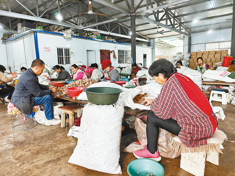 10月14日,在商州区刘湾街道仁和社区核桃加工厂内,工人们正忙着分拣核桃。据了解,该社区工厂占地200多平方米,带动30多名移民搬迁群众在家门口就业增收。 (本报记者 马 姜 摄)