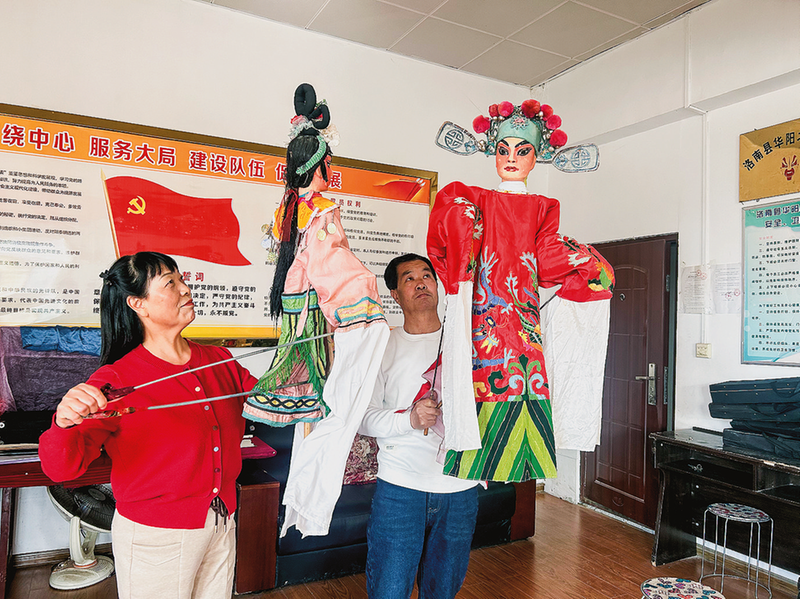 杨正明夫妻二人在表演木偶戏。