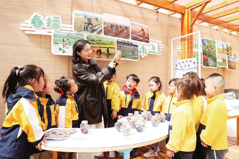 10月14日,丹凤县第九幼儿园通过种子标本展示、农耕图片讲解,带幼儿探寻粮食“从种子到餐桌”的旅程,用生动的方式在幼儿心中播下珍惜粮食的种子。 (本报通讯员 赵 洁 摄)