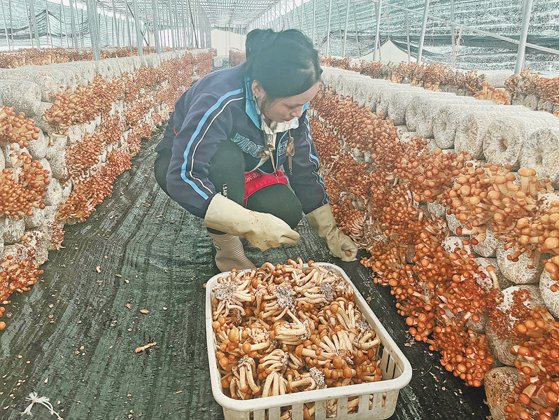 近年来,山阳县立足资源优势,以优秀企业为龙头推动食用菌产业向高端化、规模化升级,通过培育滑子菇等优质品种延伸产业链,构建稳定的联农带农机制,助力群众增收。图为10月21日,群众在中村镇沟口社区大棚内采摘滑子菇。