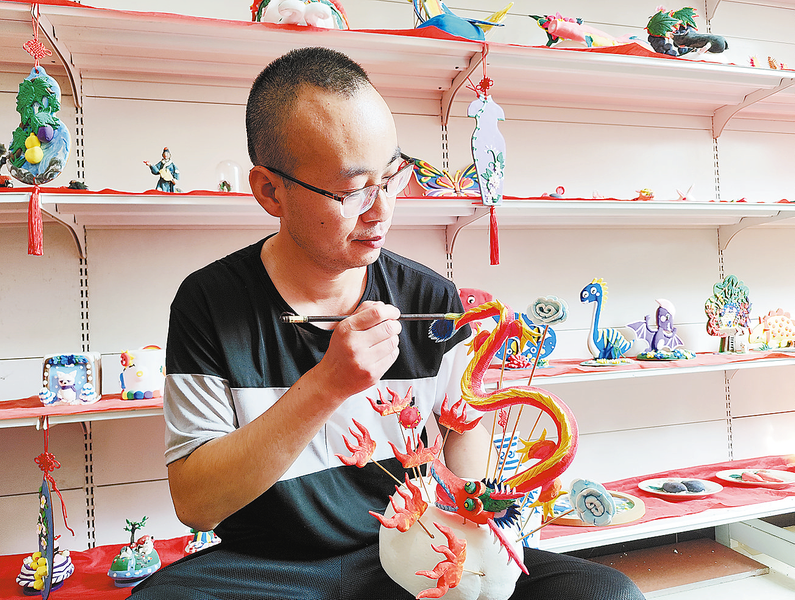 10月10日,张广新给面花上色。10月10日,走进张广新的丹凤面花工作室,展品架上造型新颖的《龙凤呈祥》《孔雀开屏》,形象逼真饱满的《寿星花馍》《福禄寿喜》,还有他创作的卡通人物和神话故事人物,个个形态各异、栩栩如生,令人爱不释手。