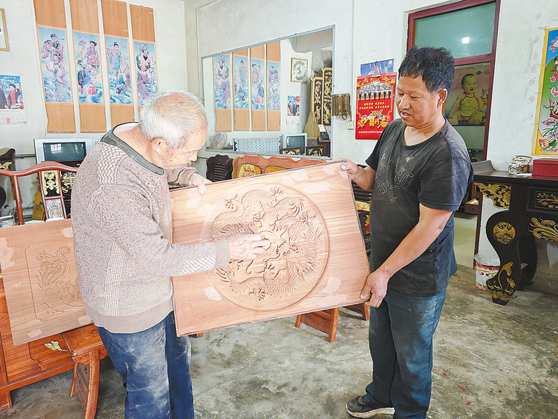 10月9日,党继生(左)展示儿子党军华雕刻的《二龙戏珠》。在秦岭深处的洛南县景村镇车塬村三组,秋日的阳光洒落在一处没有围墙和大门的宽敞院落。10月9日,82岁的党继生正专注地向54岁的儿子党军华传授手工木雕技艺。刻刀起落,木屑飞扬,父子俩的身影与院落中的工具构成一幅动人的画面,默默讲述着一段跨越半个多世纪的匠心传承。