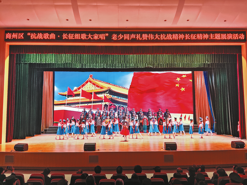 10月26日,商州区“抗战歌曲·长征组歌大家唱”主题展演活动在商州区高级中学举行。活动现场,老少群众同台高歌,以激昂的红色经典歌曲讴歌伟大抗战精神和长征精神,传承红色基因,凝聚奋进力量。 (本报记者 马泽平 摄)