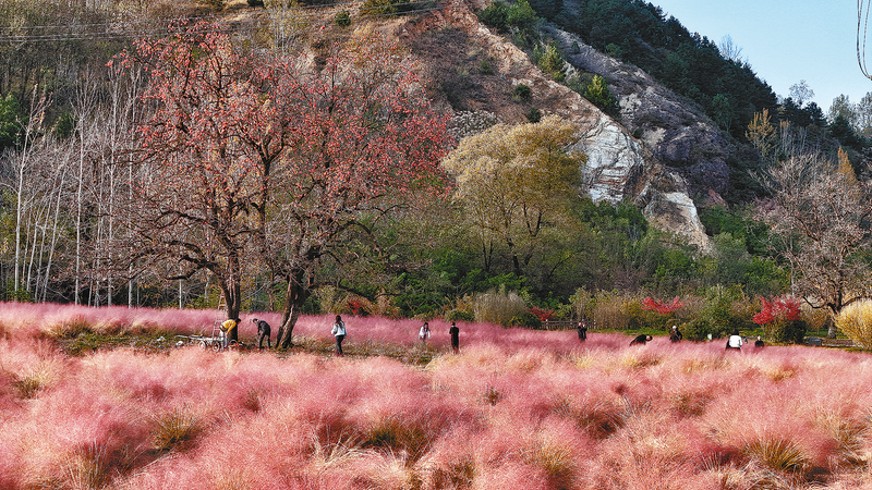 11月2日,置身于商州区江山风景区,美不仅在于引人注目的柿子树,粉黛乱子草也为秋天增添一抹绚烂。一片片粉色“云雾”仿佛是秋天的使者,散发着无尽的温柔与浪漫。柿子树不仅承载了游客对幸福生活的期许,还成为商洛秋天的一个象征,使人们在观赏之余,心头涌动着那份对美好生活的向往。当火红的柿子、粉黛乱子草与山石、游人融为一体,一幅色彩斑斓的晚秋画卷令人心旷神怡。(本报记者 杨 鑫 摄)
