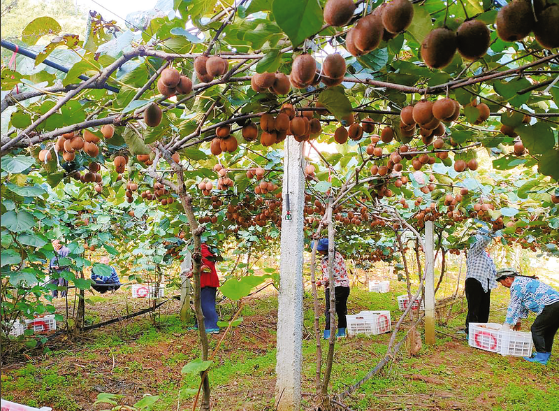 10月29日,商南县富水镇龙窝村果农袁师傅走进果园,和村民一起采摘今年第一批成熟的猕猴桃,篮筐逐渐被填满,拉货车在田埂上往来穿梭。龙窝村党支部书记汤继涛表示,为了应对异常天气,村里提前组织群众加强排水和护理。虽然个头和产量受到了一些影响,但果子的品质依然过硬,甜度经过检测甚至比往年更为浓郁。 (本报通讯员 罗姗姗 摄)