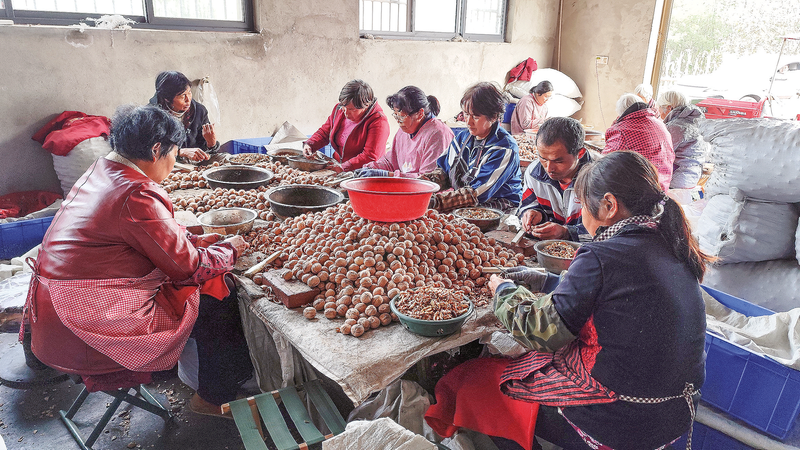 10月31日,在丹凤县商镇王塬村关柱农副产品经营部,务工群众正在剥核桃。据了解,该经营部年加工核桃130多吨,村里30多名群众在此务工,每人每天收入30至60元不等。