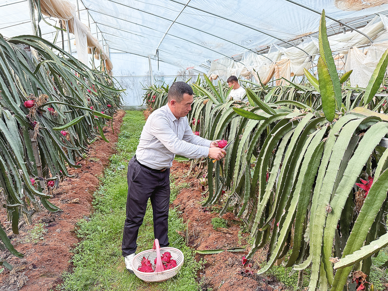 11月4日,位于商州大赵峪街道的火龙果基地,38亩田地上的7个大棚里,台湾优质品种火龙果长势正旺。耘夫农业种植合作社不仅把“甜蜜事业”越做越大,更带动周边群众每年务工达3000人次,用特色种植铺就致富路。 (本报记者 谢 非 摄)