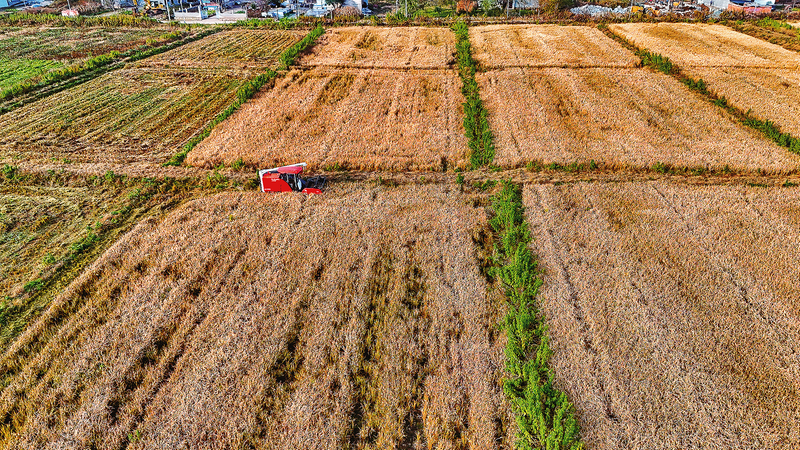 11月3日,在位于张郭村占地面积1000多亩的“稻虾共生”项目基地内,宋树红驾驶着自己新购买的联合收割机,来回穿梭在金黄的稻田中,争分夺秒确保稻谷颗粒归仓。