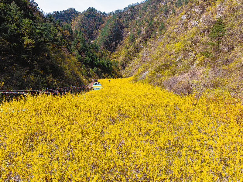 依托秦岭山水资源,商洛将连翘花海与乡村旅游深度融合,打造出特色文旅IP,吸引省内外游客前来赏花、休闲,实现“颜值”“价值”双提升。唐开成四年(839年)春,杜牧自宣州返长安,途经商州麻涧。忽见云岚四合,桑柳依依,10余户人家散落山间,恍入桃源,倦意顿消,遂赋《商山麻涧》以记: