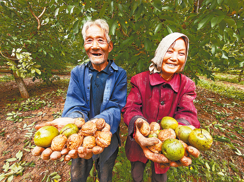 从美国加利福尼亚州引种的红仁核桃,具有仁色鲜红、营养价值高、口感酥脆微甜等特点,市场前景广阔。图为9月13日,洛南县景村镇红仁核桃基地里,群众在采收红仁核桃。 (本报记者 杨 鑫 摄)