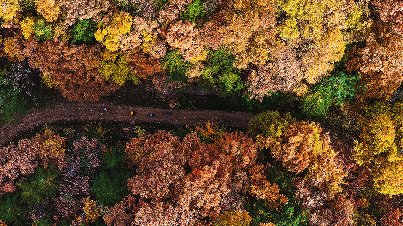 △俯瞰老林沟,树上各色叶子交织在一起,如同一幅五彩斑斓的画。