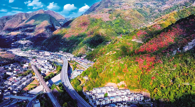 △在柞水县下梁镇,红绿相间的叶子层层叠叠点缀在山间,把小镇周围变成了彩色,远远望去煞是美丽。
