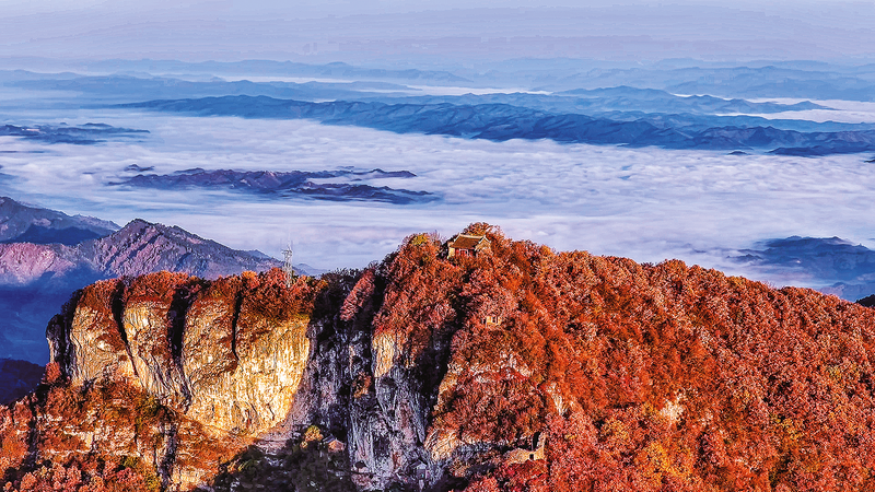 △位于洛南县高耀镇的文显山林木茂密。深秋时节,满山红叶色彩浓烈,衬托得山间流动的云海更为壮观。