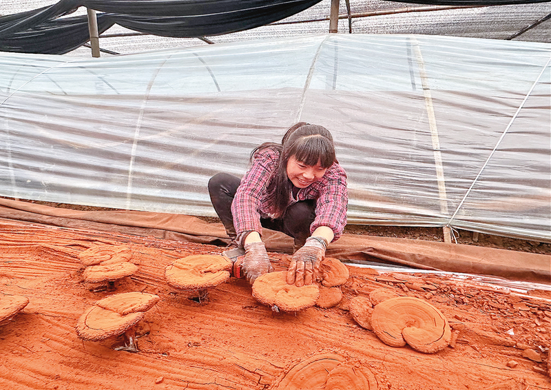△食用菌产业园为周边群众提供务工岗位,让群众实现稳定增收。图为工人何芬正在剪灵芝。