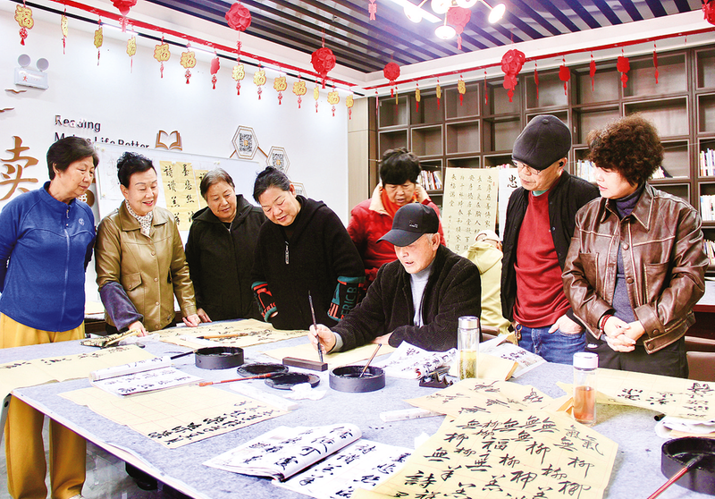 教室的另一边,几位学员正围着荆长绳请教问题。“楷书讲究的是‘筋肉丰满’,起笔的时候要慢一点,把笔锋藏好。”荆长绳坐在学生中间,仔细讲解。不知不觉间,一节课的时间过去了。下课后,老人们并没有立刻离开,而是围在一起,互相交流着自己的作品,分享着学习的感悟,教室里充满了欢声笑语。